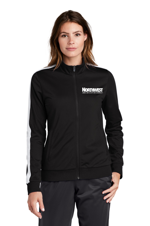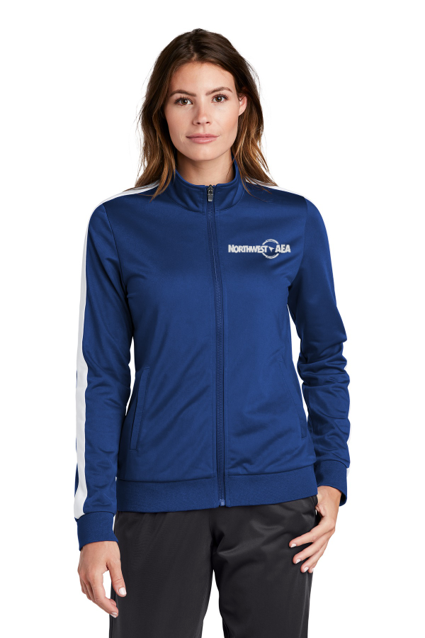 Sport-Tek Ladies Tricot Track Jacket Choice of 4 colors. LST94 The classic tricot track jacket with pieced stripes and rib knit details.100% polyester tricot 100% polyester rib knit cuffs and hem Soft-brushed backing Cadet collar Tag-free label Reverse coil zipper Pieced stripe on shoulders and sleeves Front pockets Product Spec Sheet Color Swatch