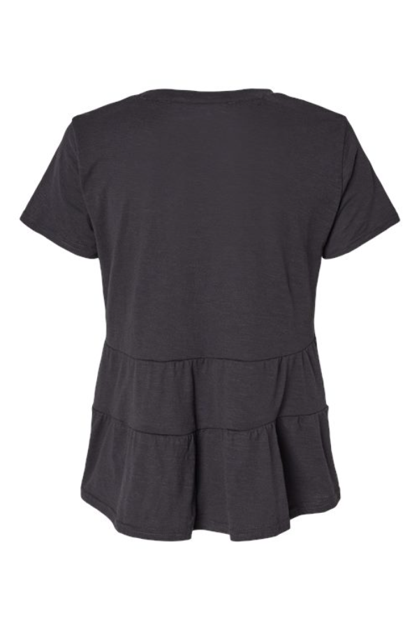 60/40 cotton/poly, Regular fit, Ruffle hem detailing, Self-neck band/ self-back neck tape.