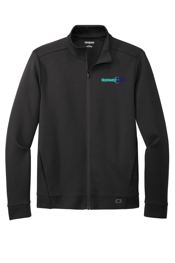 Description Left chest logo embroidery. Clean design lines and a matte appearance give this double-knit full-zip a minimalist look with understated OGIO edge.8.9-ounce 77/23 cotton/poly Zip-through collar OGIO heat transfer label for tag-free comfort Reverse coil zipper with black metal pull Forward shoulders Articulated elbows Slash pockets Black reflective O heat transfer on front left hem