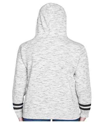 A010C JA8674 Holographic Logo J America Ladies' Melange Scuba Neck SweatshirtFabric: 7.25 oz. 60% cotton, 40% polyester melange fleece Features: Scuba hood Contrast drawcords Front pouch pocket Rib waist & cuffs Two contrast stripes on each sleeve |