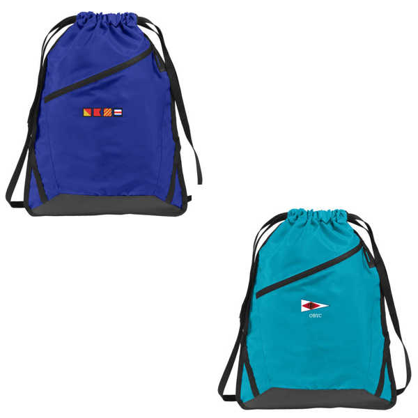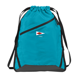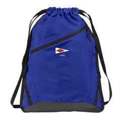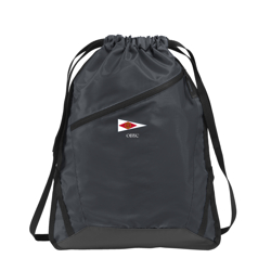 210 denier polyester with 600 denier polyester coated canvas zippered cinch pack. Measures 18.75"h x 13.5"w.