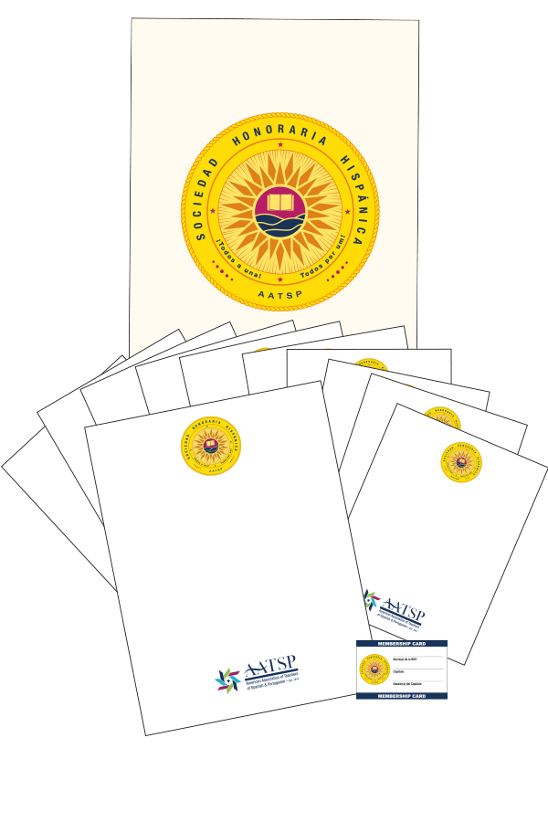 10 Certificates with the SHH & AATSP seals in full color. The downloaded file has instructions for printing Personalized Membership Certificates with the Student Name, Chapter, and Induction Date. Included are 10 Cream Lined Covers with the SHH Seal in full color, corner pockets and acetate covers to protect the certificates.