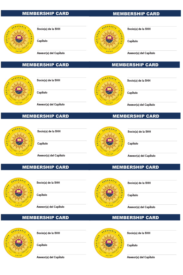 Description SHH Membership Cards with the SHH logo printed in full color with lines to print the Student and Chapter Name and a place for the Advisor / Sponsor to sign.