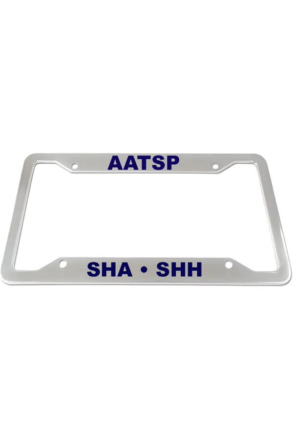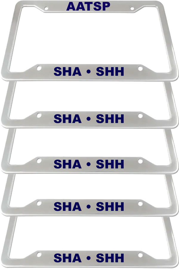 SHH-PKGCARFRAME FIVE (5) STAINLESS STEEL LICENSE PLATE FRAMES Show off your membership in a distinctive International Organization. The stainless steel license plate frame proudly displays the AATSP-SHA-SHH initials. Add to your vehicle today.