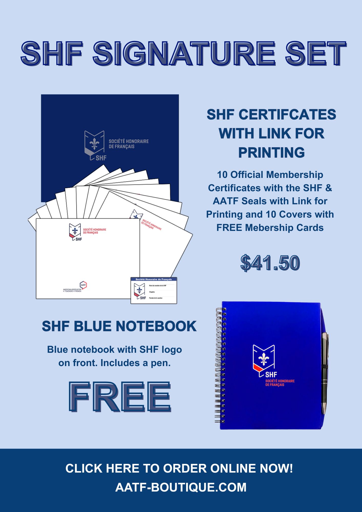 SPECIAL 3: SHF Certificates with Link for Printing with FREE Notebook SHF SIGNATURE SET Purchase 10 SHF Honor certificates with the SHF and AATF seals in color. The downloaded file has instructions for printing SHF Honor Certificates with the Student Name, Chapter, and Induction Date. Package includes SHF covers. Receive a FREE SHF Notebook!