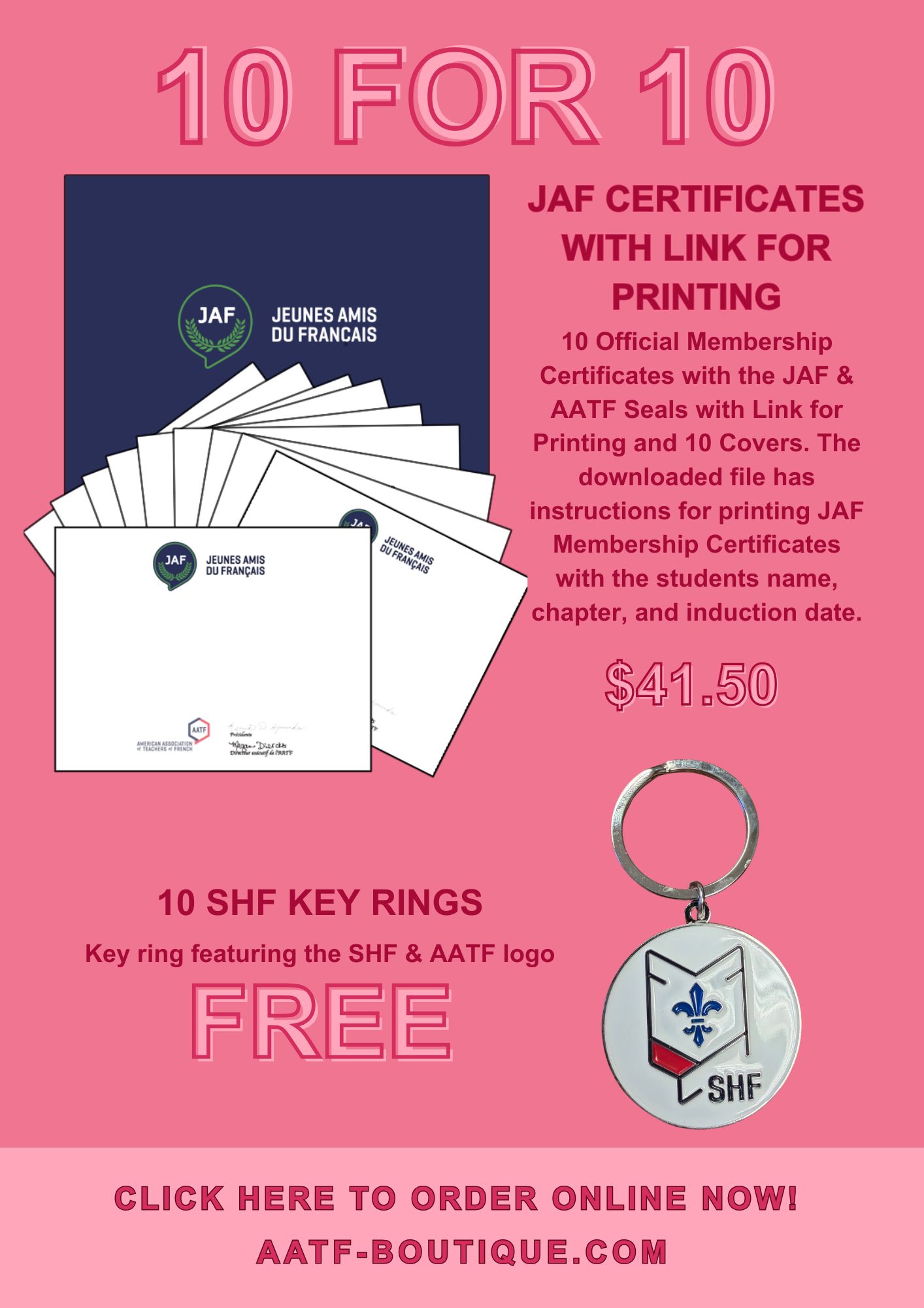 SPECIAL 8: JAF CERTIFICATES WITH LINK FOR PRINTING WITH 10 SHF KEY RINGS 10 FOR 10 Purchase 10 JAF Honor certificates with the JAF and AATF seals in color. The downloaded file has instructions for printing JAF Honor Certificates with the Student Name, Chapter, and Induction Date. Package includes JAF covers. Receive 10 FREE Keyrings!
