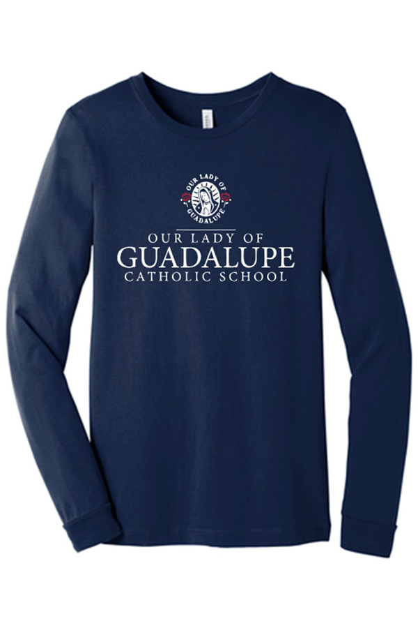 LONG-SLEEVE SHIRT/CAMISA DE MANGA LARGA Bella-youth & adult/Bella-joven y adulto Long-sleeve shirt imprinted with white and red OLG logo. Camisa de manga larga estampada con el logo OLG blanco y rojo.