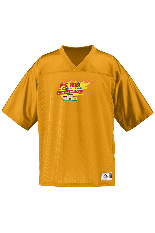 Description 3.4 oz., 100% polyester tricot mesh, 100% polyester dazzle fabric yoke and sleeves, 1x1 rib-knit modified v-neck collar, set-in sleeves, double-needle hemmed sleeves and bottom, outside locker label, not meant to be worn with pads. Personalizing the back with your name and/or number is optional. If you choose not to personalize the back of your jersey, the back will be blank.