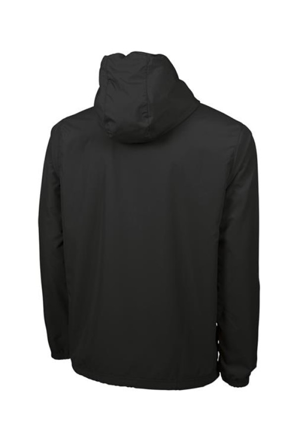 JACKET Black only 100% Softexâ„¢ Polyester, wind & water-resistant fabric for protection from the elements, heather grey jersey knit lining for comfort. Hooded full zip design with reflective, easy grab zipper pull. Covered zippered side pockets, Elasticized cuffs and open hem with shockcord drawstring. Embroidered on front left chest.
