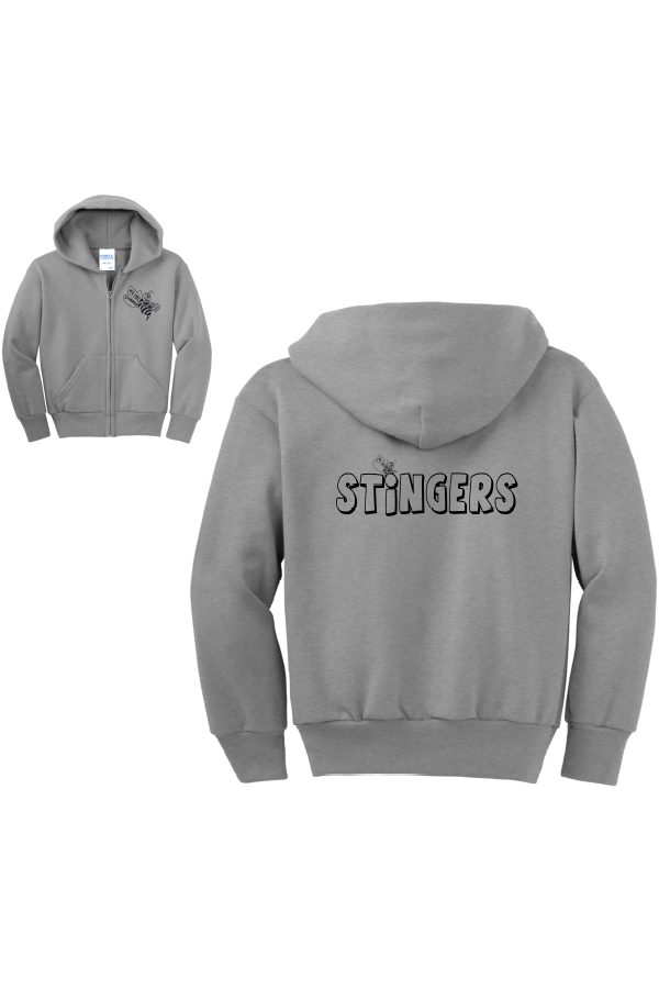 9-ounce, 50/50 cotton/poly fleece, air jet yarn for softness, two-ply hood with dyed-to-match drawcords on adult style only, YKK metal zipper, front pockets. Imprinted with PS101Q bee design on front left chest and new STINGERS design on back. Name embroidered on front right chest optional. Available in youth and adult sizes.