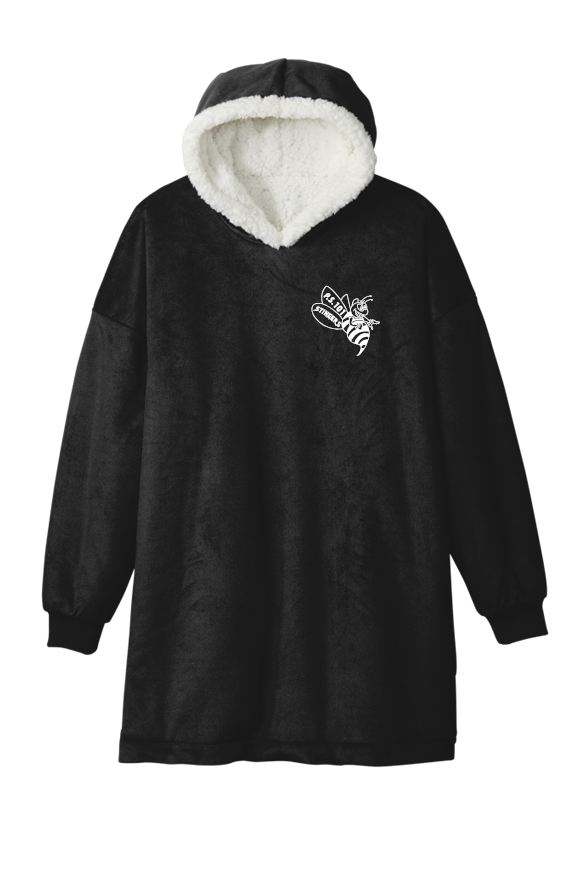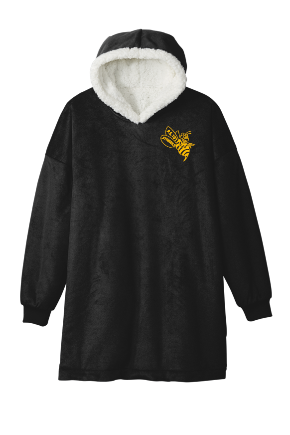 Wearable Hooded Blanket Port Authority - one size Wrap yourself up in the blanket you can wear! This oversized, hooded poncho is luxuriously soft and warm—perfect for chilly nights at home or enjoying outdoor events. 11.9-ounce linear yard, 100% polyester fleece face, 12.5-ounce linear yard, 100% polyester faux shearling lining, faux shearling-lined hood, side-entry pockets, rib knit cuffs, oversized fit. Embroidered with PS101Q bee in your choice of gold or white thread. Name embroidered on front right chest optional. Spec Sheet