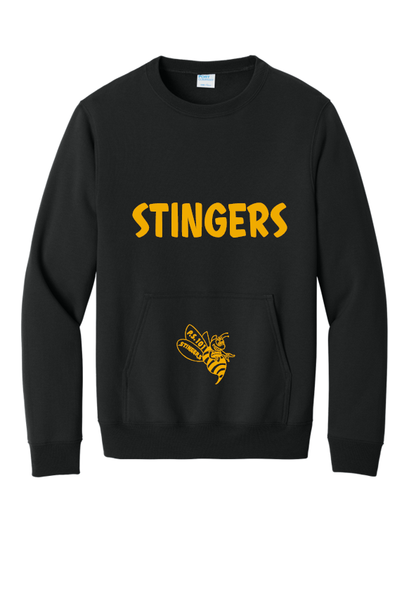 Crewneck Pouch-Stingers Port & Company - youth & adult A cozy crew sweatshirt with a pocket in 7.8-ounce, 50/50 cotton/poly fleece, air jet yarn for softness, front pouch pocket. Imprinted with STINGERS on front in your choice of gold or white print. Optional: Name printed on back. Available in youth and adult sizes. Adult Size Chart Youth Size Chart
