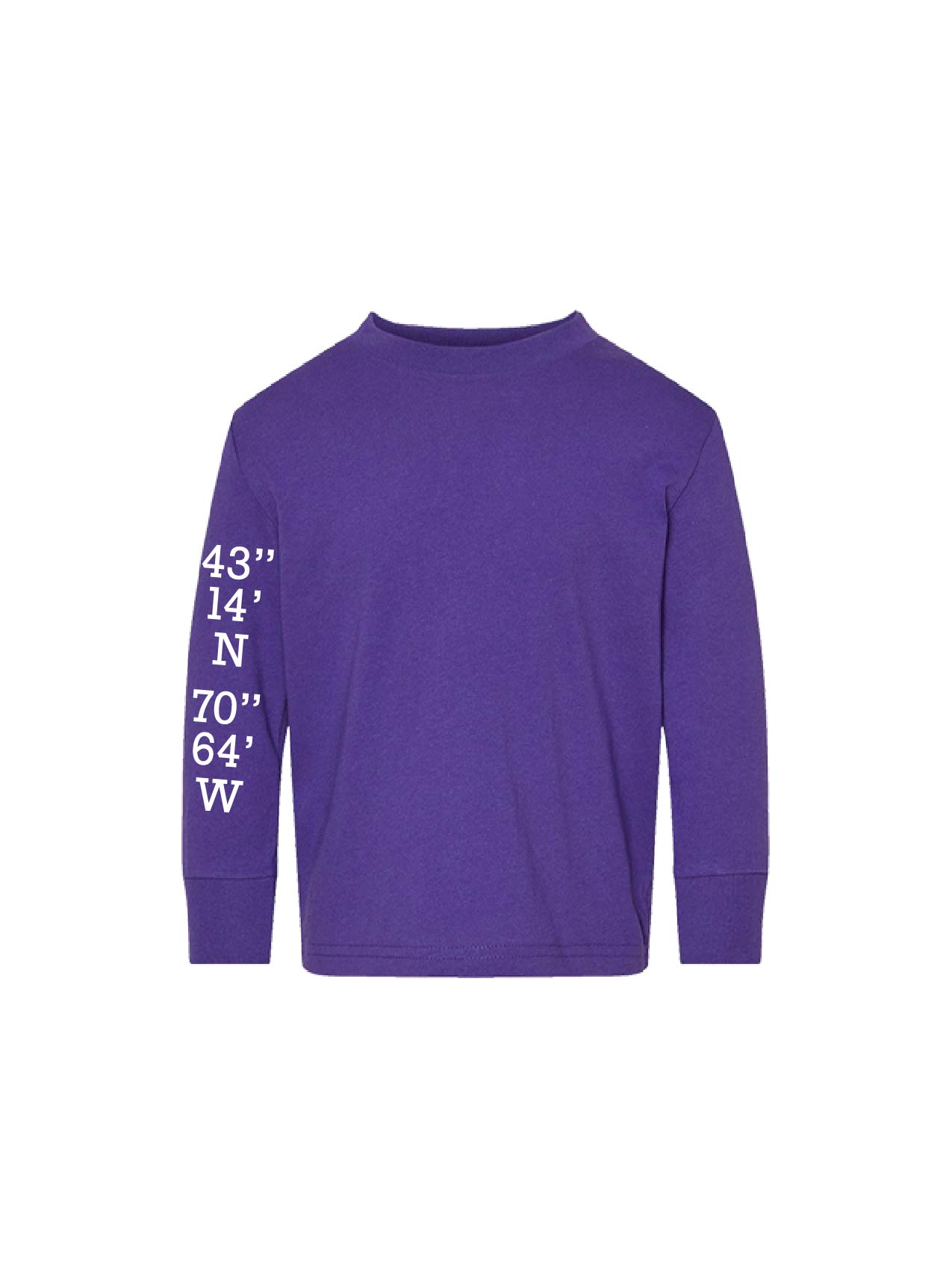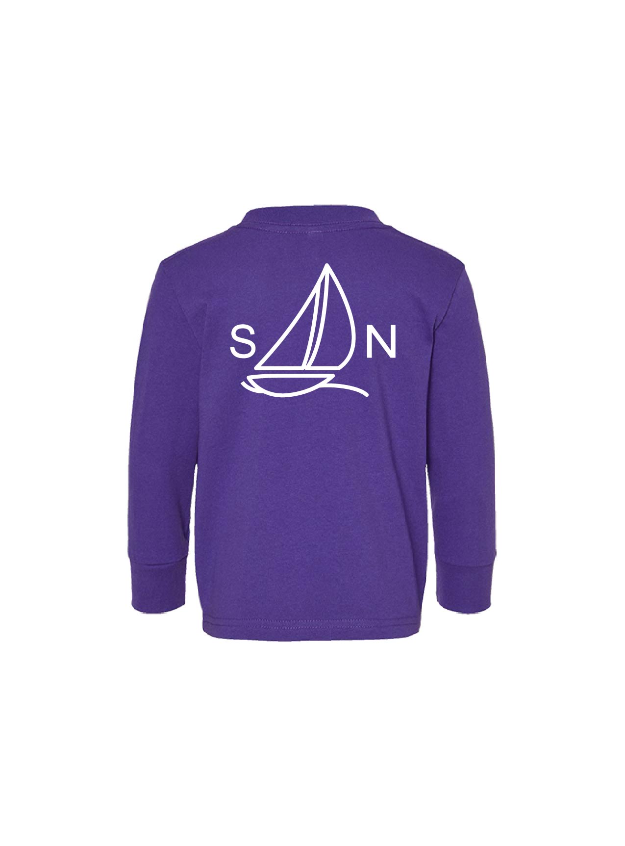 Toddler Cotton Jersey Long-Sleeve Tee Purple Screen printed with our Stage Neck Inn sailboat on the back and Gallows Point navigational coordinates along the right sleeve.