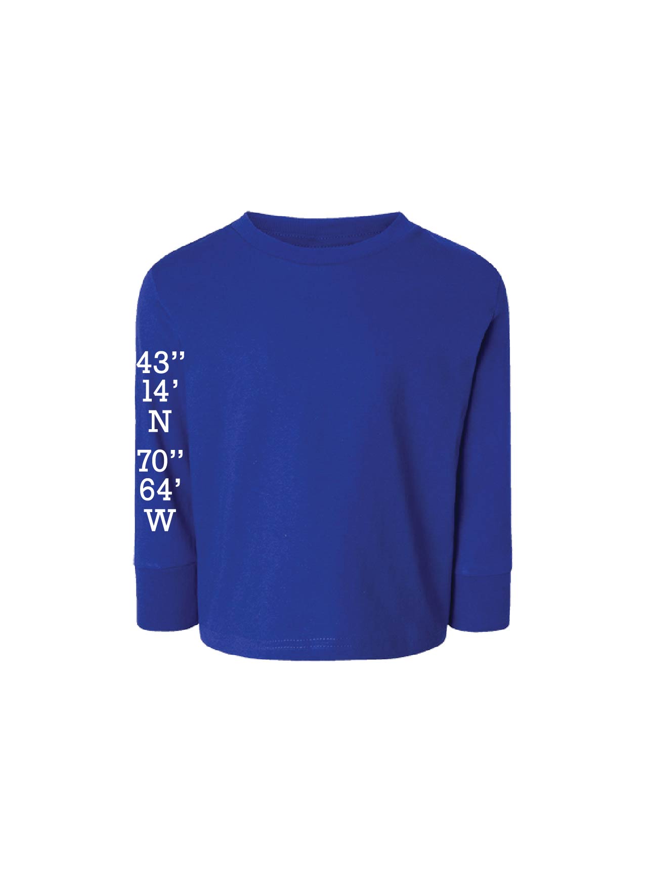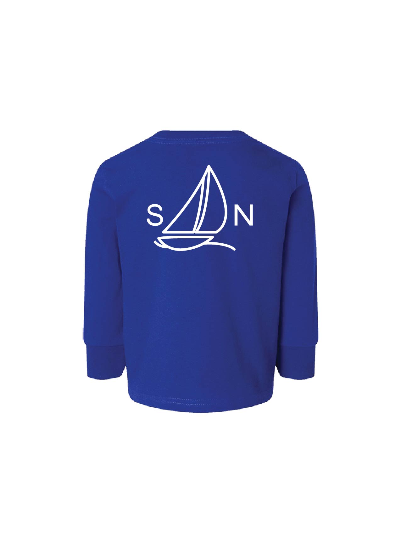 Toddler Cotton Jersey Long-Sleeve Tee Royal Screen printed with our Stage Neck Inn sailboat on the back and Gallows Point navigational coordinates along the right sleeve.
