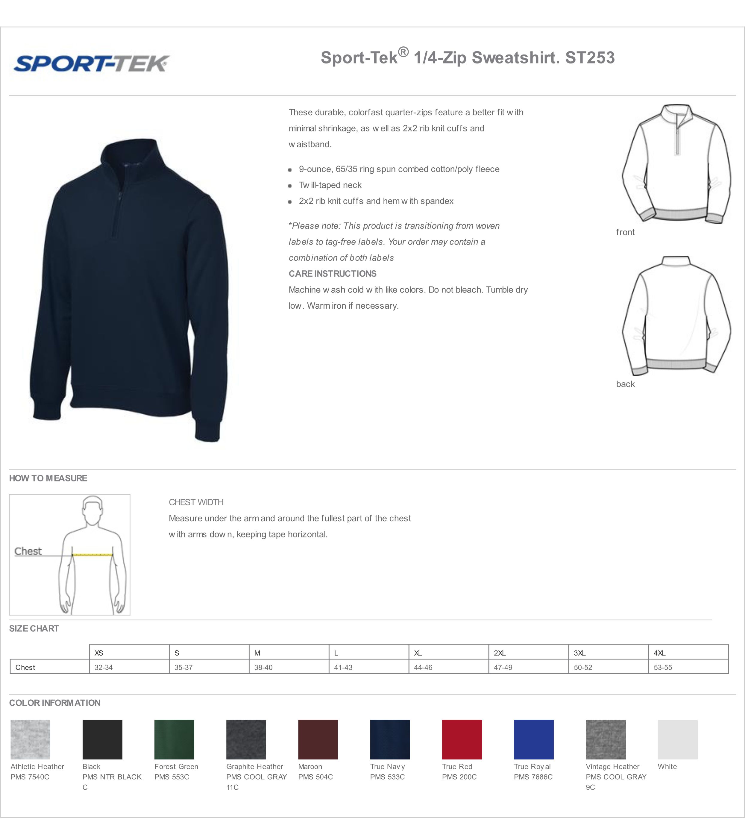These durable colorfast quarter-zips feature a better fit with minimal shrinkage as well as 2x2 rib knit cuffs and waistband.9-ounce 65/35 ring spun combed cotton/poly fleece Twill-taped neck 2x2 rib knit cuffs and hem with spandex*Please note: This product is transitioning from woven labels to tag-free labels. Your order may contain a combination of both labels