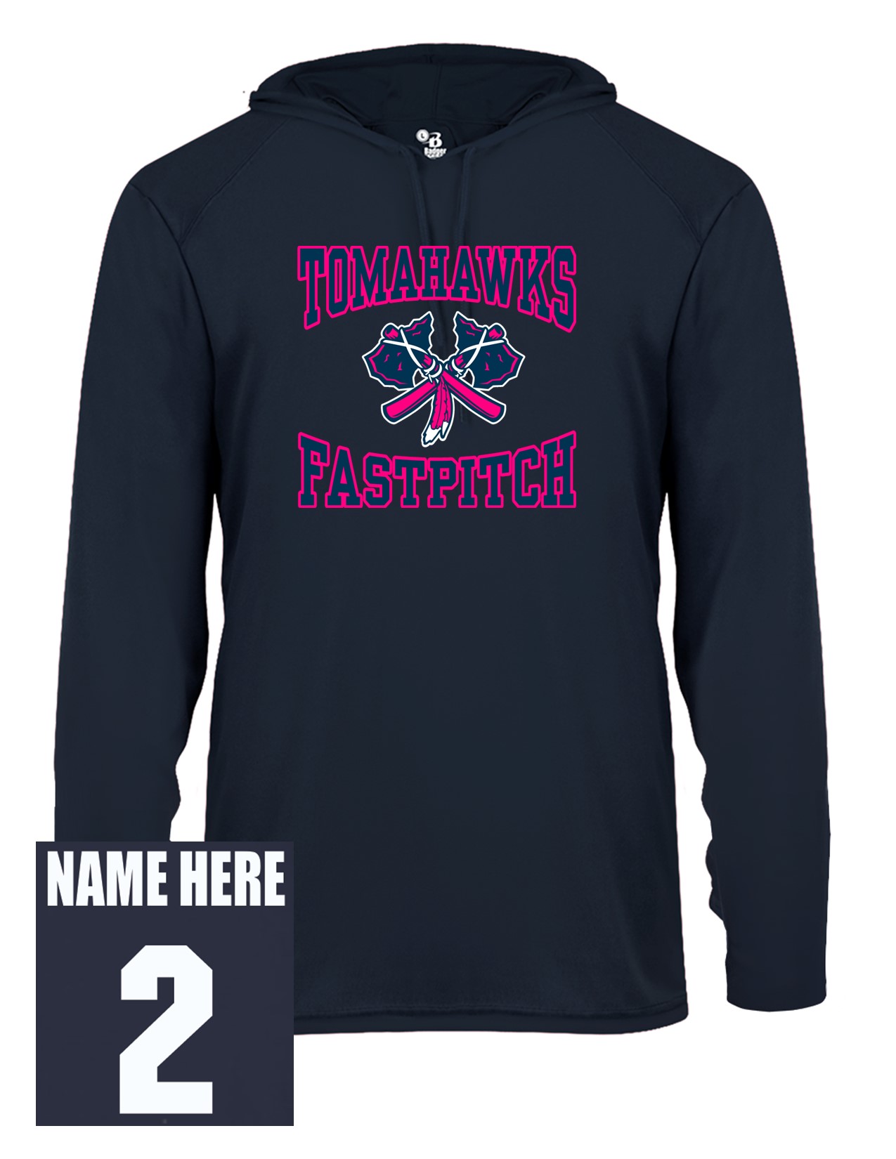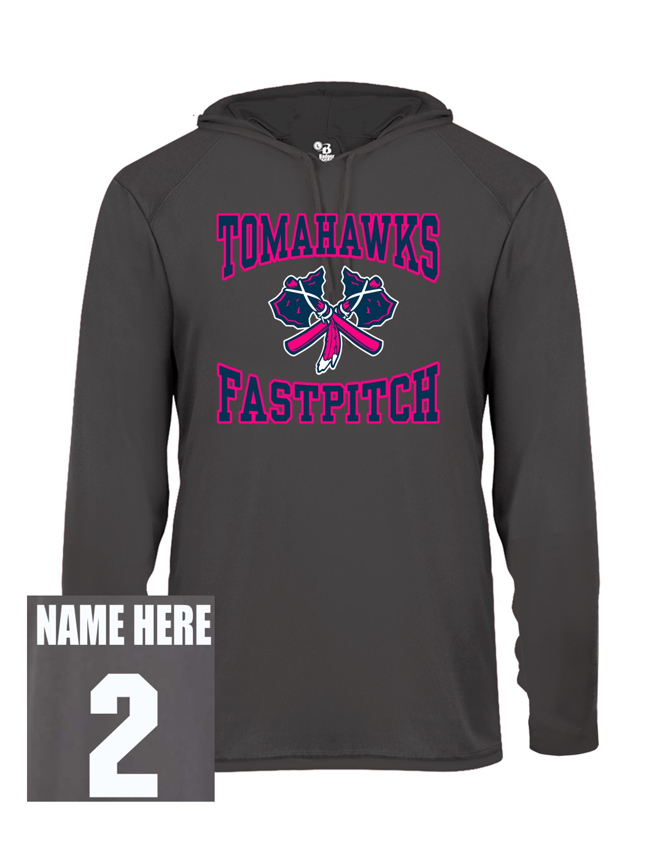 76b Badger 4105 Adult B-Core 100% Polyester Hooded Tee with Pink Front Print