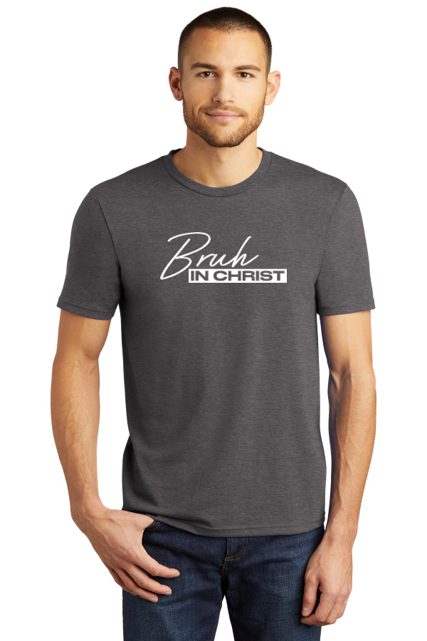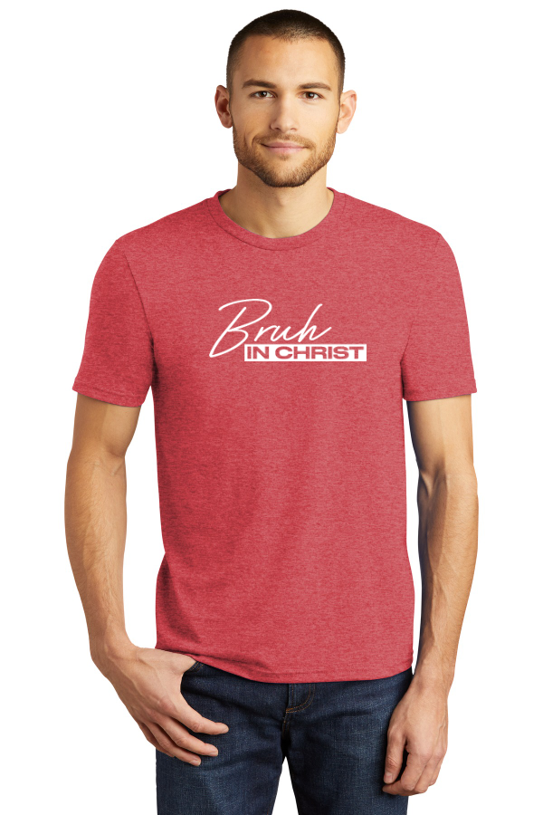 Bruh in Christ with white print District Perfect TriTee. DM130 Three yarns form the perfect easygoing look. 4.5-ounce 50/25/25 poly/combed ring spun combed cotton/rayon 32 singlesTear-away label1X1 rib knit neckshoulder to shoulder tapingPlease note: Some colors in this style are produced as both tubular and side seamed. Your order may contain a combination of both tees.Tri-Blend fabric infuses each garment with unique character. Please allow for slight color variations. Due to the heat sensitivity of tri-blend fabrics special care must be taken throughout the printing process. Consult your decorator or ink supplier for best printing practices. Product Spec Sheet Color Swatch