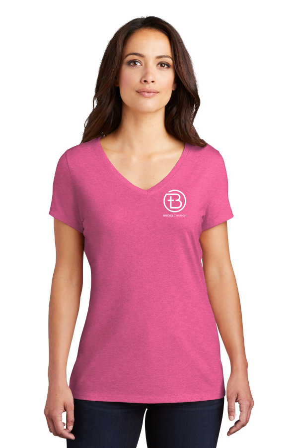 Women s Logo V-Neck with white print District Women s Perfect Tri V-Neck Tee. DM1350L Lightweight and extra soft this tee is perfect. 4.5-ounce 50/25/25 poly/combed ring spun cotton/rayon 32 singles1X1 rib knit neckShoulder to shoulder taping Tear-away labelPlease note: This product is transitioning from woven labels to tear-away labels. Your order may contain a combination of both labels.Tri-Blend fabric infuses each garment with unique character. Please allow for slight color variations. Due to the heat sensitivity of tri-blend fabrics special care must be taken throughout the printing process. Consult your decorator or ink supplier for best printing practices. Product Spec Sheet Color Swatch