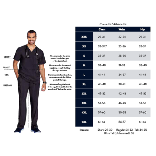 Mens/Unisex Modern fit V-neck top features a chest pocket with extra pen pocket, a back yoke and side vents. This style looks great tucked in or untucked. Center back length: 29"