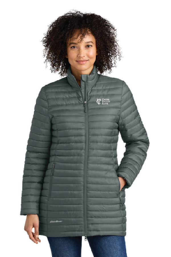 Women s Packable Quilted Full-Zip EB515Eddie Bauer Women s Packable Quilted Full-Zip EB515Designed with traditional quilt lines this insulated full-zip is built for warmth and weather-resistant performance. Features include full-length interior storm flap with chin guard exposed molded zippers with Eddie Bauer logo pulls elastic cuffs zippered hand pockets and a slight drop tail hem. Includes an embroidery access pocket. Packs into zippered left hand pocket. Longer length with a double zipper. Contrast Eddie Bauer heat transfer logo on right hem. Made of 100% polyester ripstop and 5.4-ounce 100% polyester blown fill. PU coating on back of shell. Durable water-repellent (DWR) finish. |