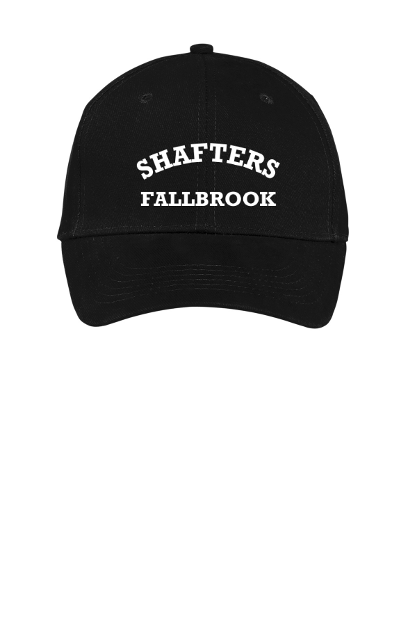 Cap with Shafter's Fallbrook-Embroidery Red or Black Port & CompanyBrushed Twill Cap. CP82 This soft-brushed twill cap looks great wear after wear.Fabric: 100% cotton brushed twillStructure: StructuredProfile: MidClosure: Self-fabric closure with brass buckle and grommet Product Spec Sheet Color Swatch