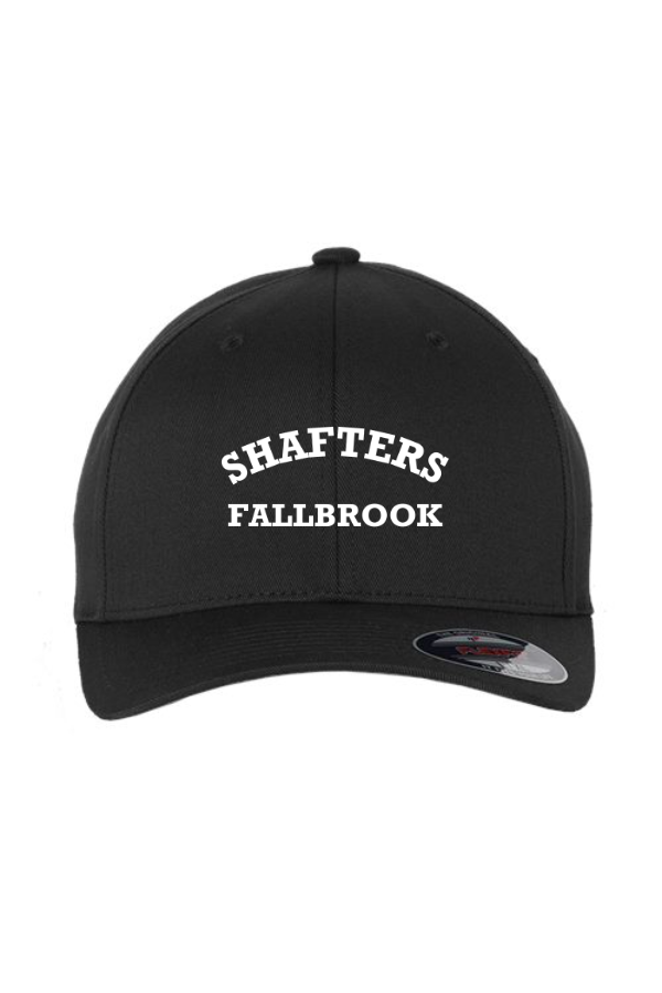 Flexfit Cap with Shafter's Fallbrook-Embroidery Red or Black Fitted Cap Flexfit 6277 with sizes S/M- L/XL FLEXFIT THE ONE AND ONLY ORIGINAL® 6-panel, structured, mid-profile, wool-like texture, 63/34/3 polyester/cotton/PU, spandex twill, 3½" crown, Structured, mid-profile, six-panel, hard buckram backed front panels, sewn eyelets; eight-row stitching on bill, spandex sweatband retains shape