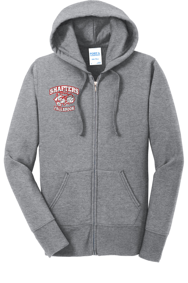 Ladies Full-Zip Hood Sweatshirt-EMBROIDERY Black or Sport Grey Ladies Fleece Full-Zip Hooded Sweatshirt Cozy sweats in our core weight.7.8-ounce 50/50 cotton/poly fleece Air jet yarn for softness Jersey-lined hood with dyed-to-match drawcords Side seamed with a contoured body for a feminine fit YKK metal zipper Front pockets Product Spec Sheet Color Swatch