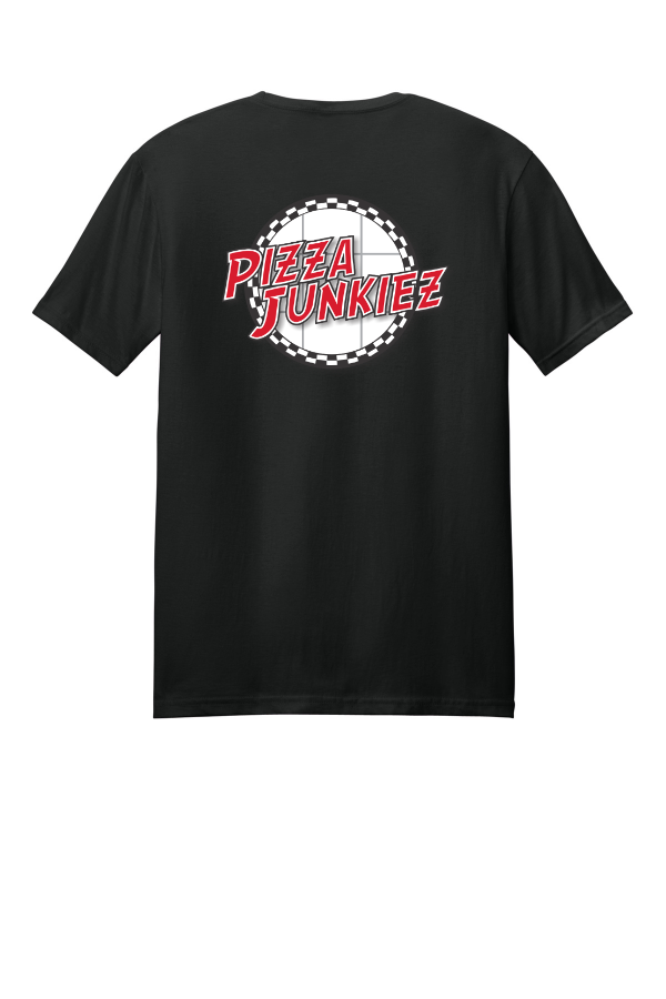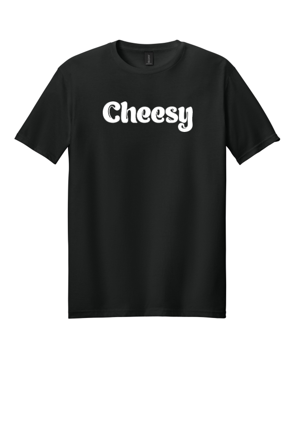 Cheesy / Pizza Junkiez TShirt Cheesy / Pizza Junkiez T-Shirt. 64000 4.5-ounce 100% ring spun US cotton. Non-topstitched rib collar. Taped neck and shoulders. Recycled high-performing black tear-away label. Modern classic fit, seamless body. Double-needle sleeves and hem. Product Spec Sheet